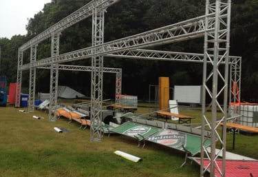 Montagem técnica de backdrops e estruturas robustas para ambientes imersivos.